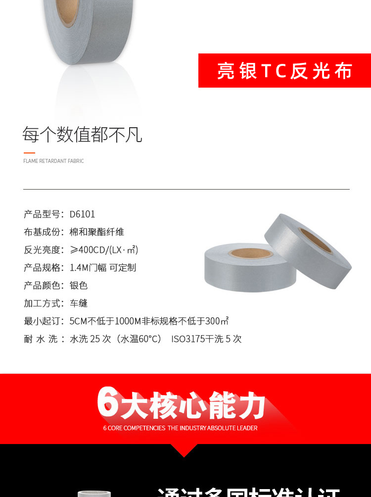 | D6101 | 亮银TC反光布 | 1.3米门幅 可定制 | 银色 | 车缝 | 5cm不低于1000m 非标规格不低于300㎡ |